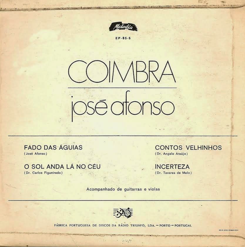 "José Afonso, sendo ainda estudante, gravou este fado em 1952, sob o título “FADO DAS ÁGUIAS”, acompanhado à guitarra por António Brojo e António Portugal e, à viola, por Aurélio Reis e Mário de Castro (disco MELODIA, 15.097, de 78 rpm). No citado disco, e nas subsequentes reedições deste fado, consta sempre o nome de José Afonso como autor da música e da letra, o que é comprovadamente falso.