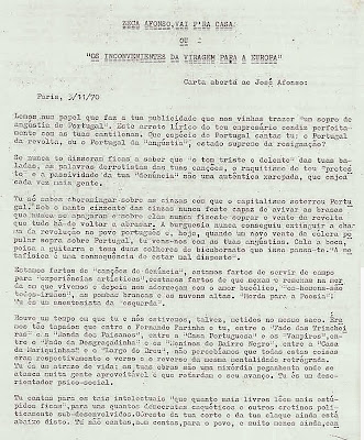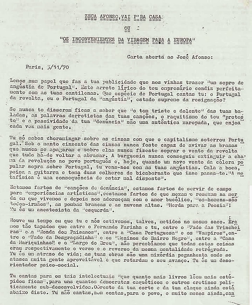 A 10 de novembro de 1970, Zeca participa, com Sérgio Godinho, José Mário Branco, Luís Cília e o Trio Portugal, num espetáculo na “Mutualité”, sala mítica de Paris, em que é confrontado com um folheto de extremistas de esquerda, distribuído à entrada, o qual questiona a postura política de alguns cantores, nomeadamente José Afonso, Tino Flores e Luís Cília, e que o acusa de ser colaborante com o sistema e de, com isso, conseguir viver em Portugal e continuar a gravar discos.