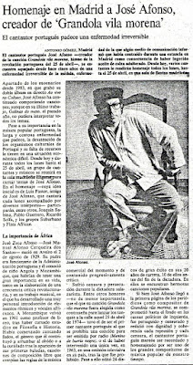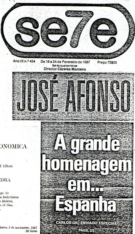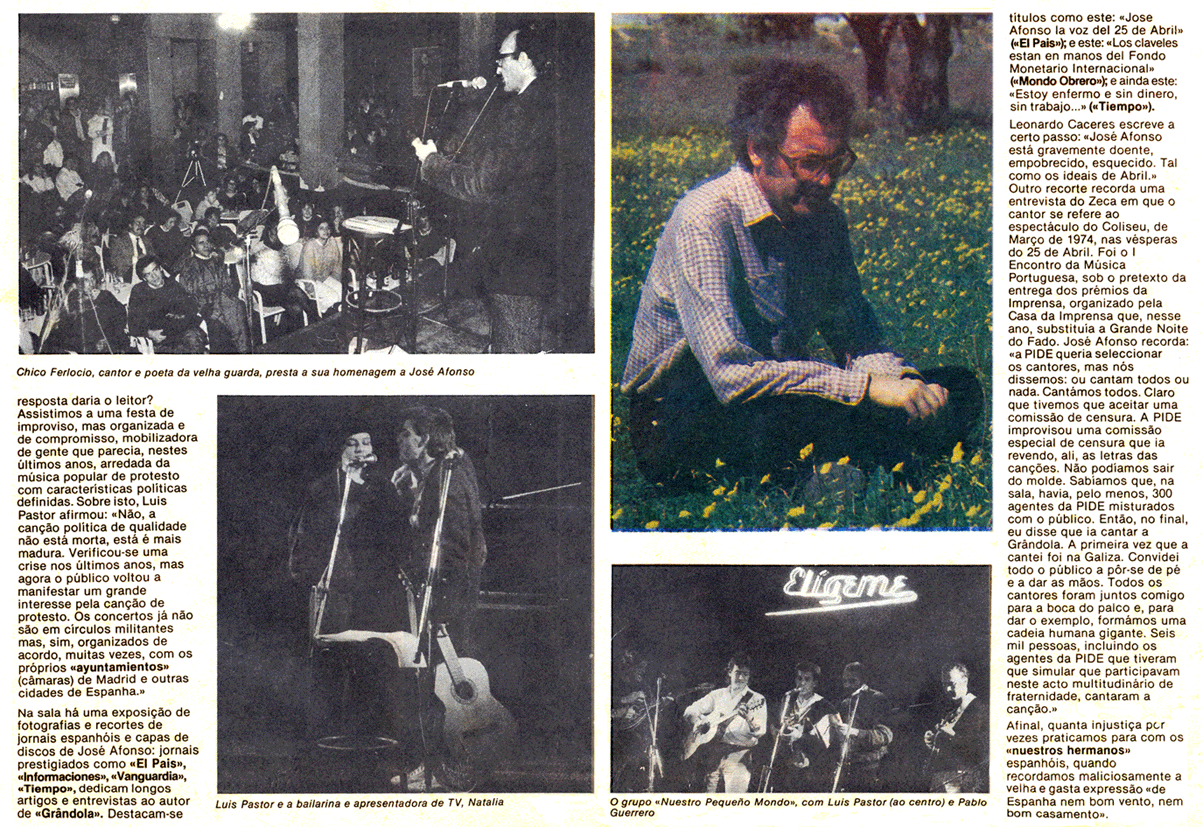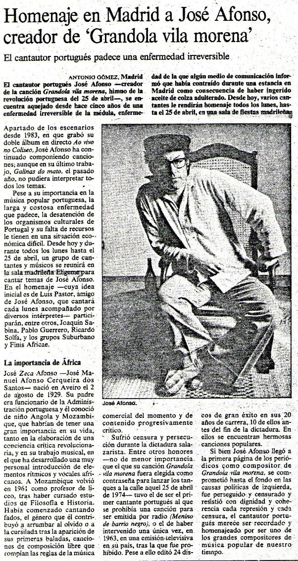 "A propuesta de Luis Pastor, organizamos los lunes (segundas-feiras) de Zeca Afonso. El histórico artista portugués se debatía entre la vida y la muerte, aseguraban muchos que por culpa del aceite de colza. Sea como fuere estaba muy presente en la trayectoria artística y personal de Luis, y a los demás nos entusiasmó la idea. Así nacieron los lunes de Zeca Afonso, con la participación de muchos artistas, algunos fijos, como el propio Luis, Pablo Guerrero, Mosaico, etc., y otros que se acercaban algún día, como Amancio Prada, José Antonio Labordeta, Luis Eduardo Aute, Javier Ruibal, Chicho Sánchez Ferlosio, artistas portugueses invitados, Benedicto… En ese enero importante nos sacan en un estupendo reportaje en el dominical de Diario 16. Y es que la prensa nos hace mucho caso, la verdad es que nos mimaron durante toda la vida del Elígeme, como se puede apreciar en los recortes que conservo. Y aquí no hay presencia de radio, ni de televisión, que también hubo."