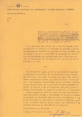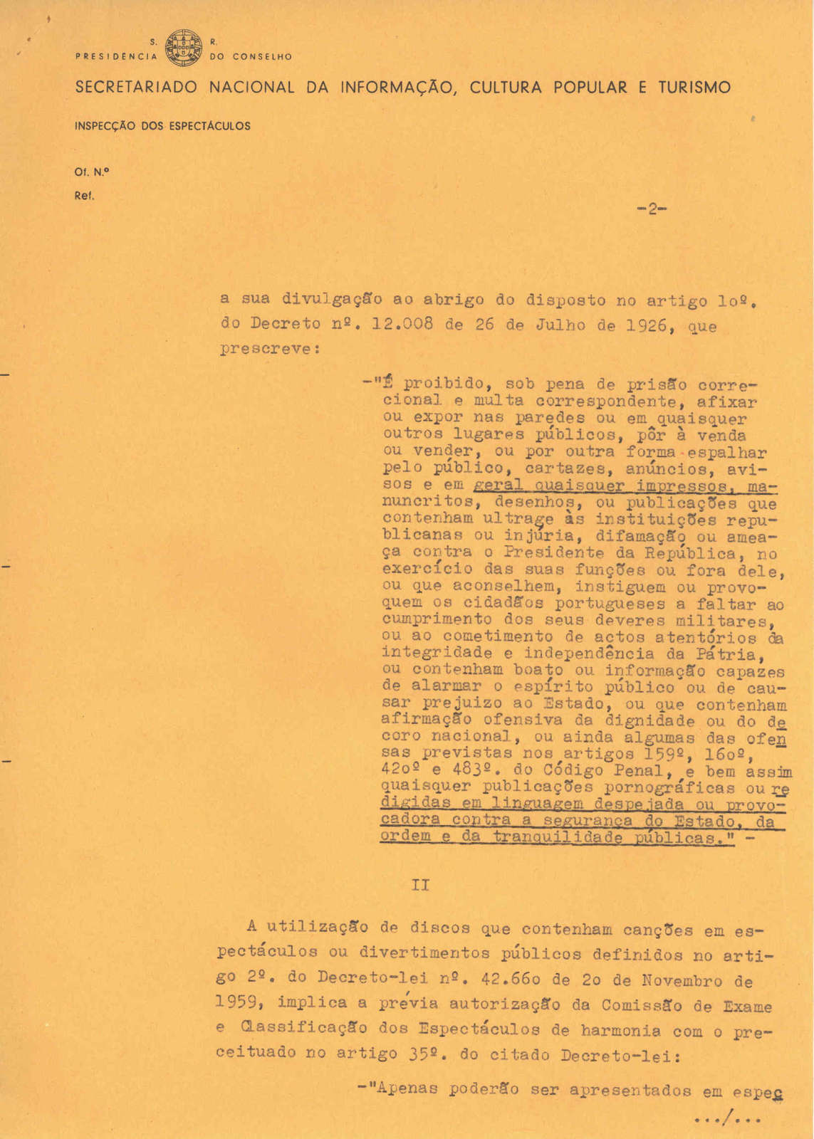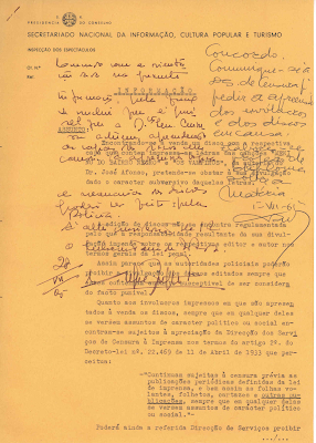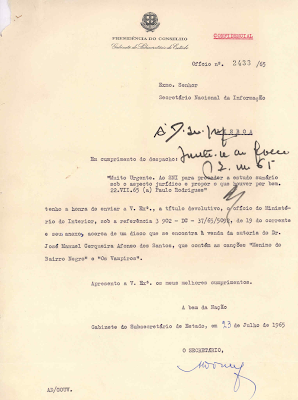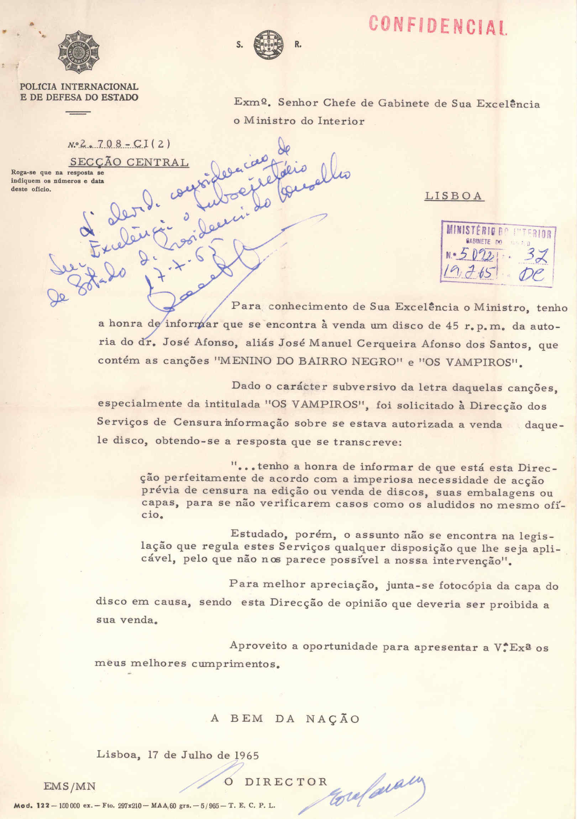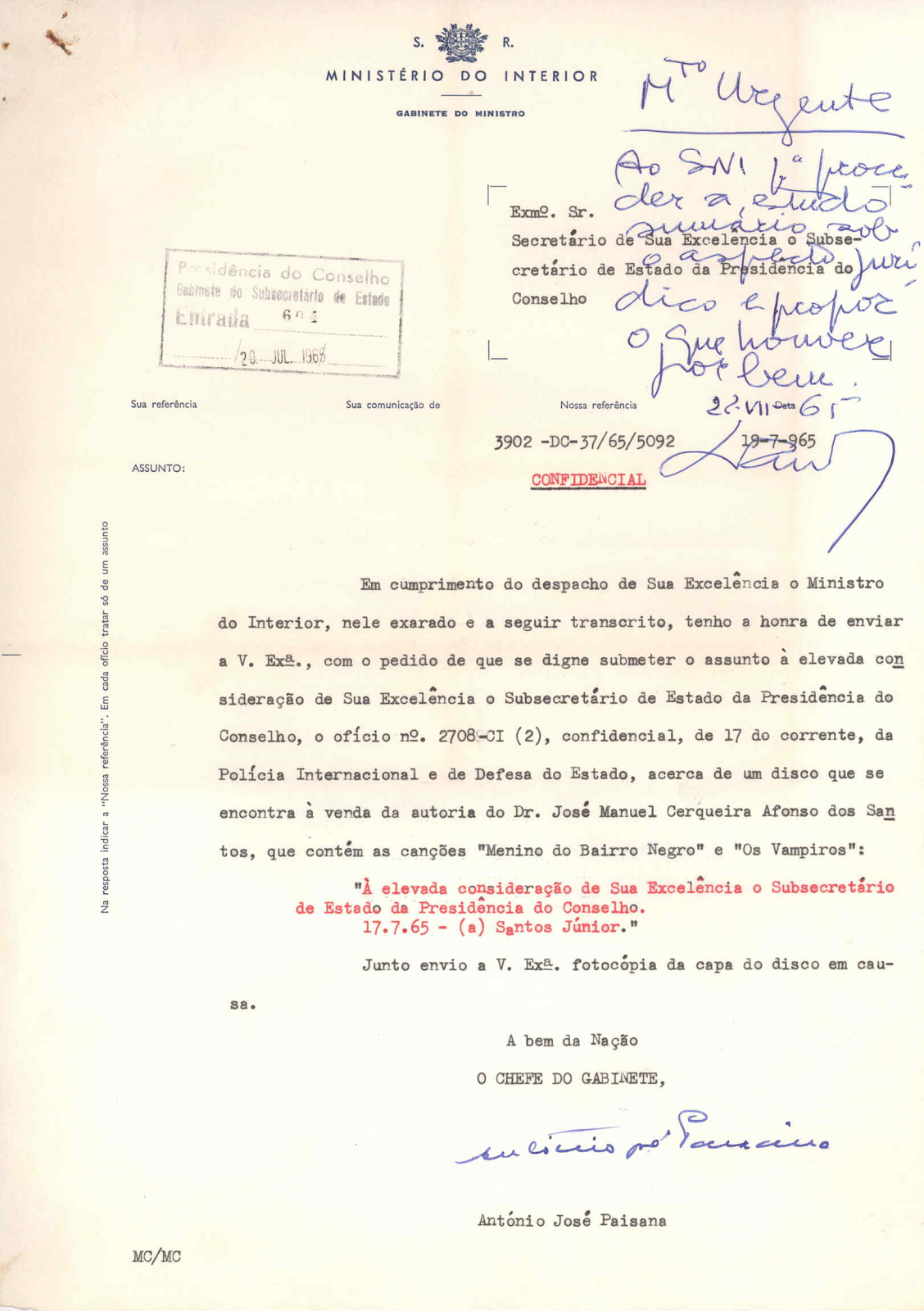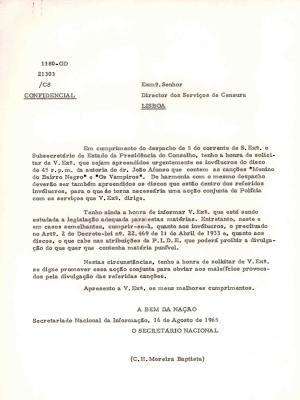 Assunto: Capilha do Secretariado Nacional da Informação contendo diversos documentos relativos à instrução do pedido aos serviços de Censura para a apreensão dos exemplares do disco de Zeca Afonso, que continha as canções "Menino do Bairro Negro" e "Os Vampiros".